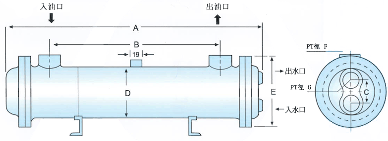 形式編號(hào) | A | B | C | D | E | F | G | 散熱管 | 散熱面積 | 油箱容量 | 重量 | 泵浦流量 | 水流量 |